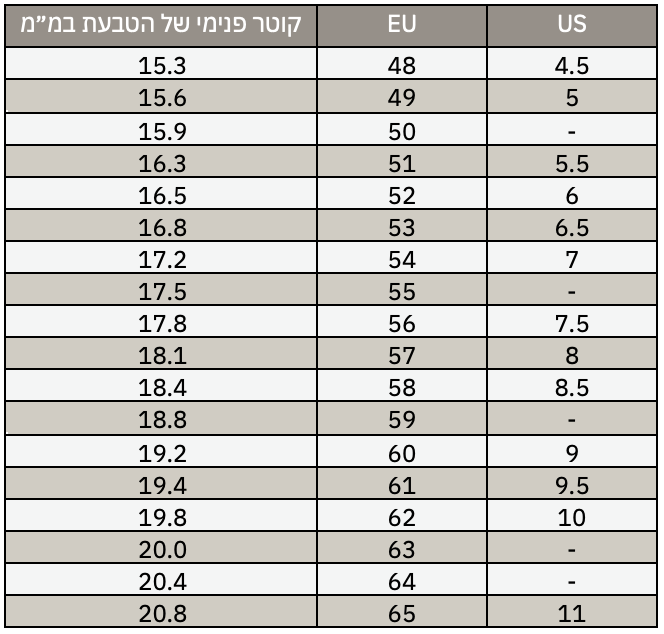 (מקצה אחד לקצה השני של הטבעת בחלק הפנימי) - את התוצאה שיצאה המירי בעזרת טבלת המידות המצורפת למטה.
